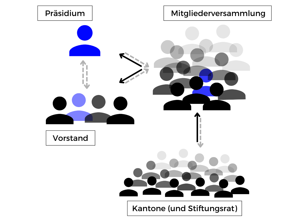 Das Präsidium und der Vorstand (Präsidium + 3) arbeiten der Mitgliederversammlung zu, die Mitgliederversammlung den Kantonen und dem Stiftungsrat.