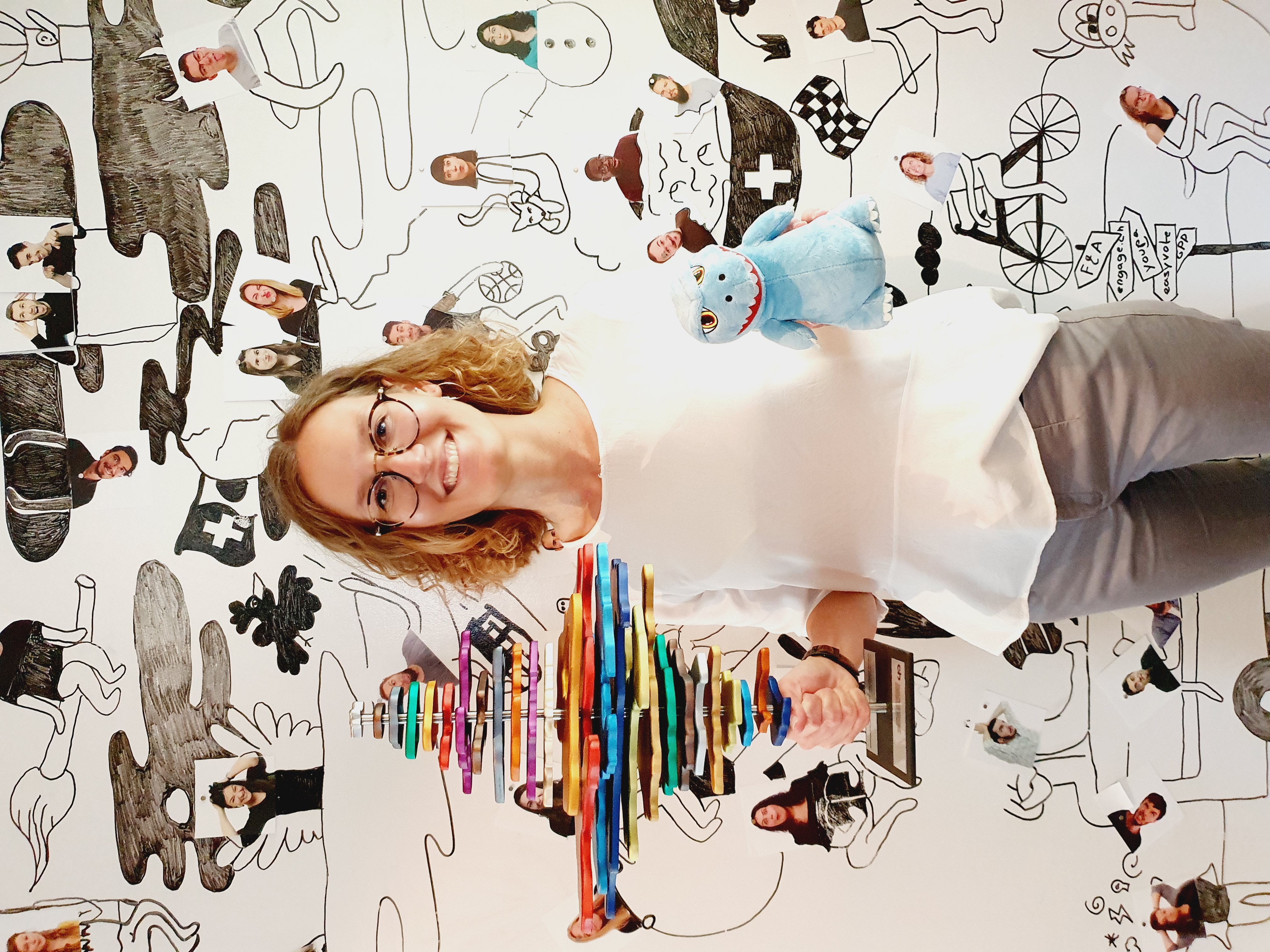 Bild Begleitet vom Maskottchen Votezilla, Alice Zollinger, Mitglied von easyvote, nimmt die Trophäe stolz entgegen.