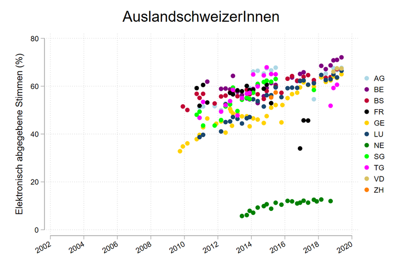 Übrigens stellt der Kanton Neuenburg bezüglich der Nutzugswerte eine interessante Ausnahme dar, denn dort blieb der Anteil der elektronisch abgegebenen Stimmen und Wahlzettel mit 5-15% gerade auch bei den AuslandschweizerInnen deutlich tiefer als in den anderen Kantonen. Der Grund liegt darin, dass in Neuenburg nur vom e-voting Gebrauch machen konnte, wer sich vorgängig persönlich bei der zuständigen politischen Gemeinde für das kantonale e-government-System eingeschrieben hat. Andere Kantone stellten die notwendigen Zugangsdaten den Stimmberechtigten in der Regel automatisch zu, was das elektronische Wählen und Stimmen signifikant einfacher macht und die Nutzung positiv beeinflusst.