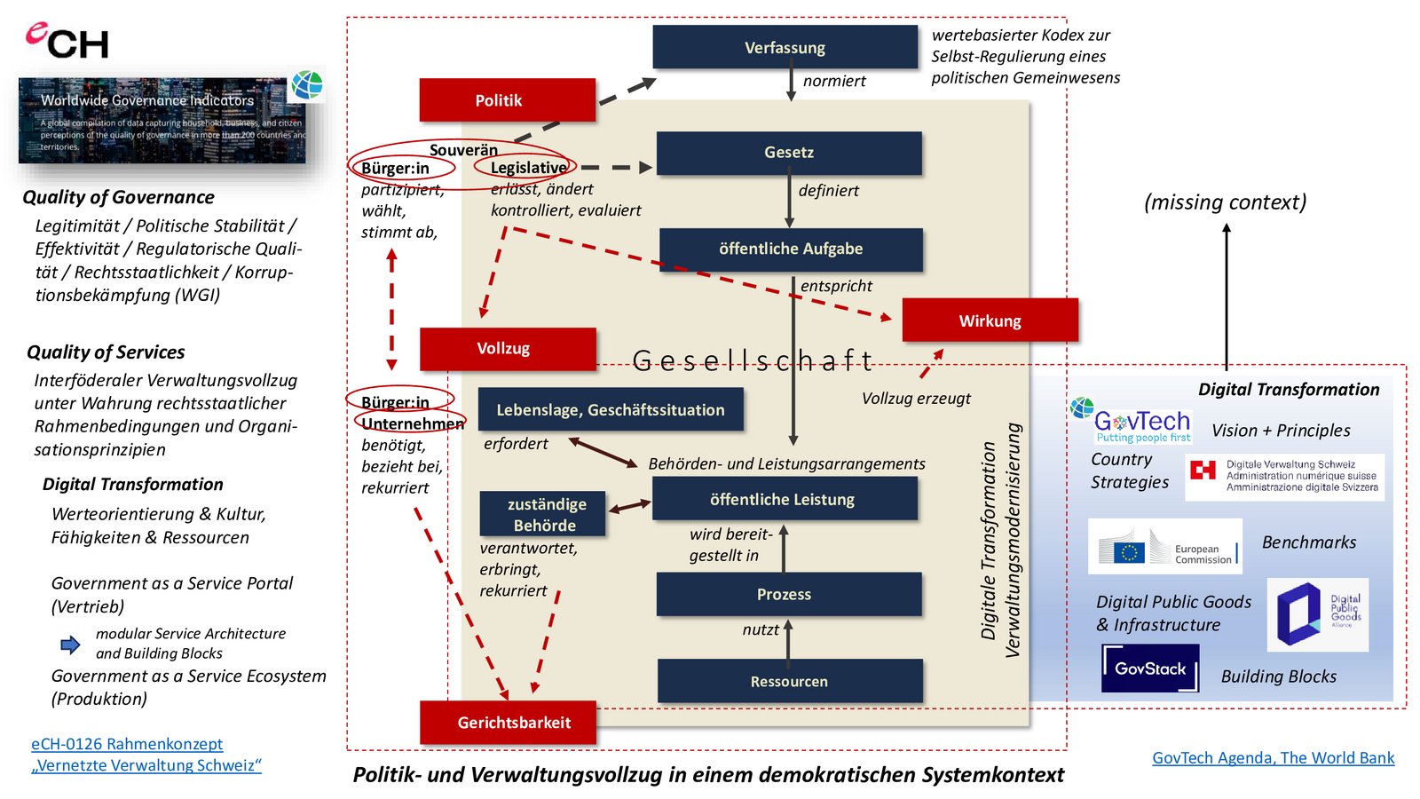 - Der übergeordnete Bereich der Politik, d.h. der demokratischen Aushandlung dessen, was Staat und Verwaltung mit welchen Wirkungen für die Gesellschaft erbringen sollen (quality of governance, gemäss WGI).