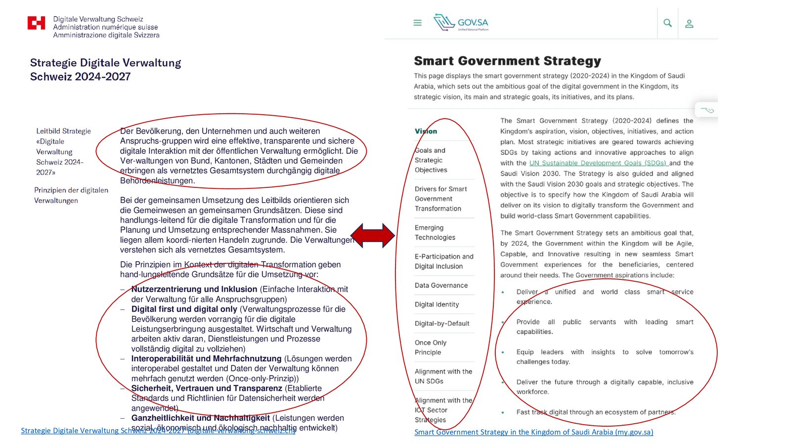 Es ist daher auch kein Zufall, dass nationale Strategien zur Verwaltungsdigitalisierung – gleichgültig, ob aus der Schweiz (Motto „Digital first“), den EU-Staaten oder beispielsweise aus Saudi-Arabien – sich bezüglich Vision/Leitbild, Prinzipien, Handlungsfeldern etc. wie ein Ei dem anderen gleichen (vgl. Abb. 2). Den Verwaltungsvollzug als Komfortzone gestalten, kann durchaus den aktiven Einbezug der User beim smarten Service Design von staatlichen Leistungen beinhalten.