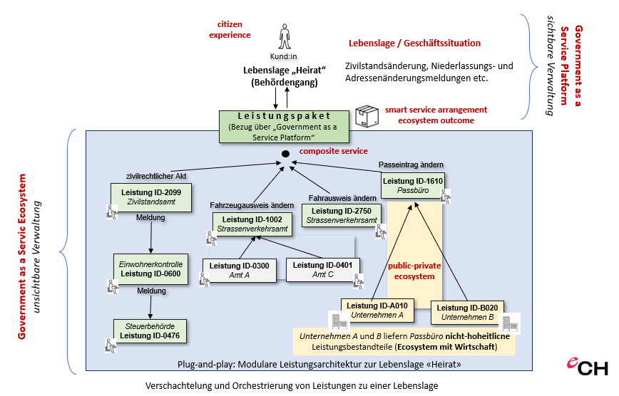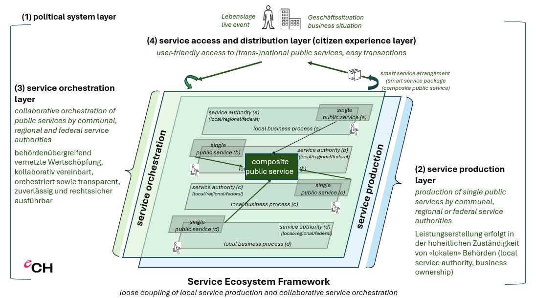 Fassen wir zusammen: Der Service Ecosystem-Ansatz von eCH für den öffentlichen Sektor (vgl. dazu die Übersicht an bereits vorliegenden eCH-Standards in eCH-0203 Ergebnisübersicht Vernetzte Verwaltung Schweiz (2021))