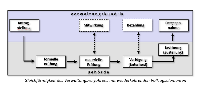 Service Design: Das Verwaltungsverfahren als Modellierungsvorlage. Mit seinen rechtsstaatlich vorgegebenen Mindeststandards bezüglich Abläufe, Transparenz, Nachvollziehbarkeit, Rechtssicherheit und Zuverlässigkeit bietet sich das Verwaltungsverfahren als methodische Vorlage (blueprint) für die einheitliche Modellierung und Implementierung von Akteur-Beziehungen im Verwaltungsvollzug an (Phasenmodell des Verwaltungsverfahrens). Die Gestaltungskomplexität der Digitalen Transformation mit ihrer Fülle an Akteuren, Leistungen, Prozessen, Zuständigkeitsebenen, Geschäftsfunktionen etc. lässt sich dadurch enorm reduzieren. Aufgrund der prozessualen Gleichförmigkeit des Verwaltungsverfahrens können Behördengänge auf der operativen Ausführungsebene mittels einer geringen Anzahl gleichartiger Vollzugselemente abgewickelt werden (Abb. 1/1).
