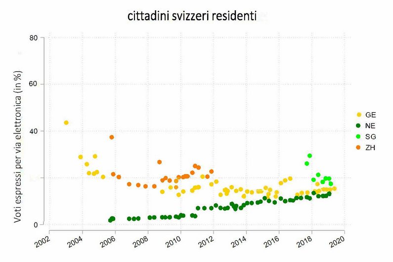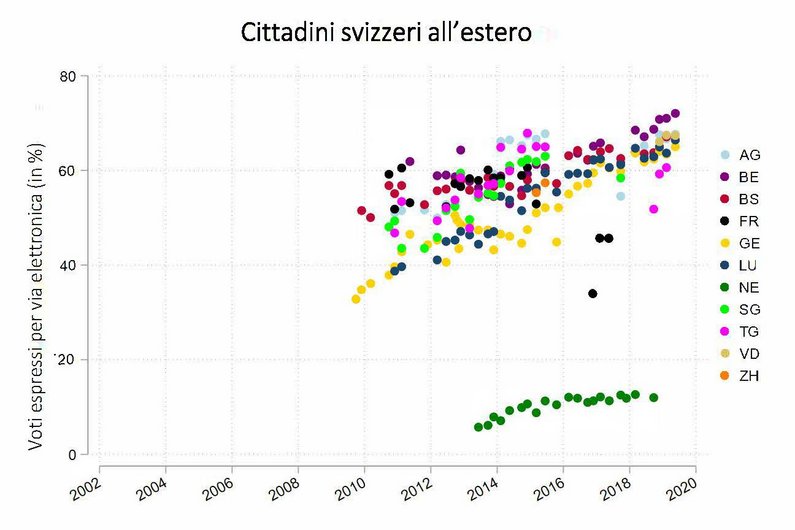 Diversa è la situazione per gli svizzeri all’estero. In uno studio di recente pubblicazione, il sottoscritto ha analizzato l’impatto del voto elettronico tra gli svizzeri all’estero di otto Cantoni. Lo studio mostra che grazie alla possibilità di votare per via elettronica la loro partecipazione è aumentata di 4-6 punti percentuali. Un documento da poco pubblicato dall’Ufficio di statistica del Cantone di Ginevra giunge alla stessa conclusione. La differenza si giustifica con il fatto che per gli svizzeri all’estero l’e-voting è decisamente più vantaggioso rispetto al voto per corripondenza.